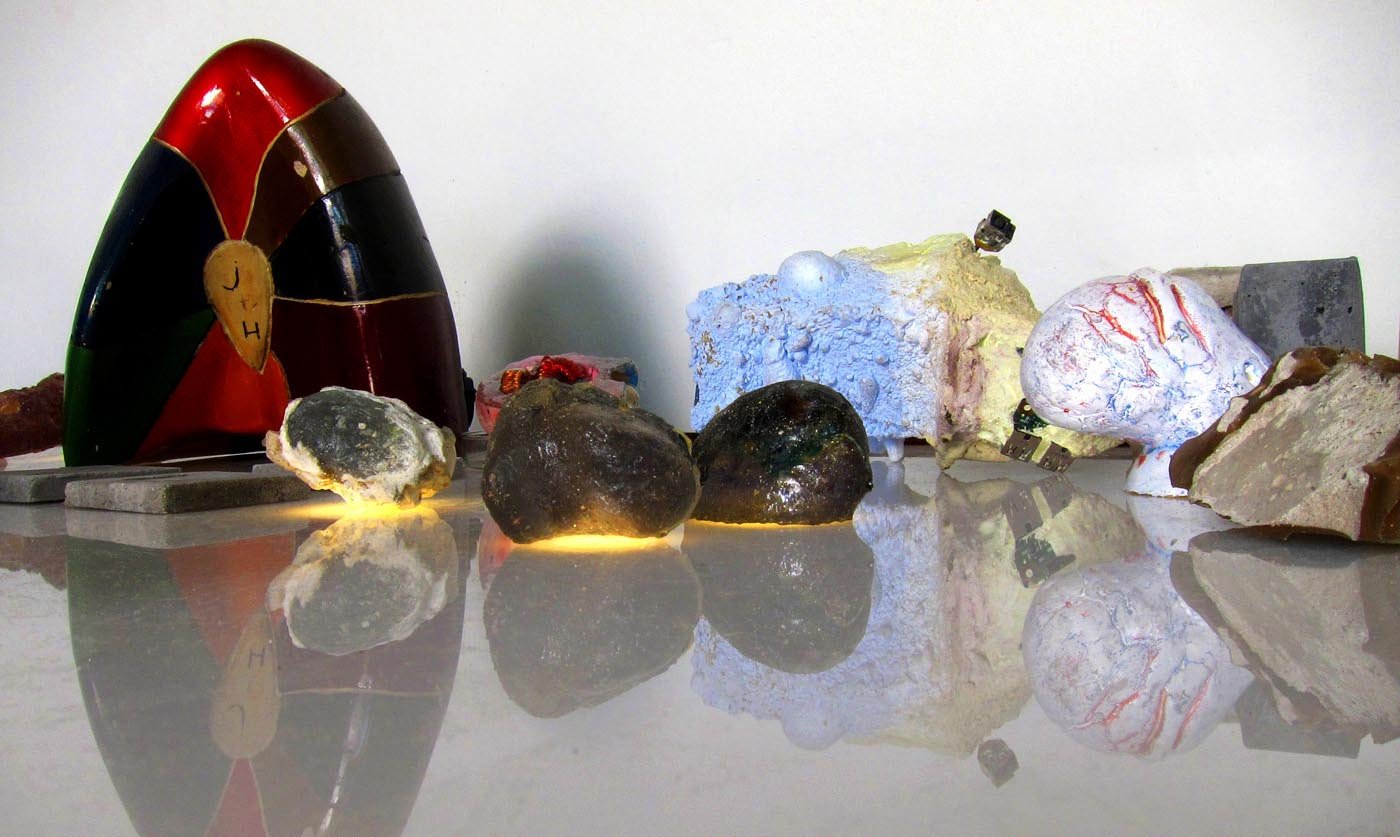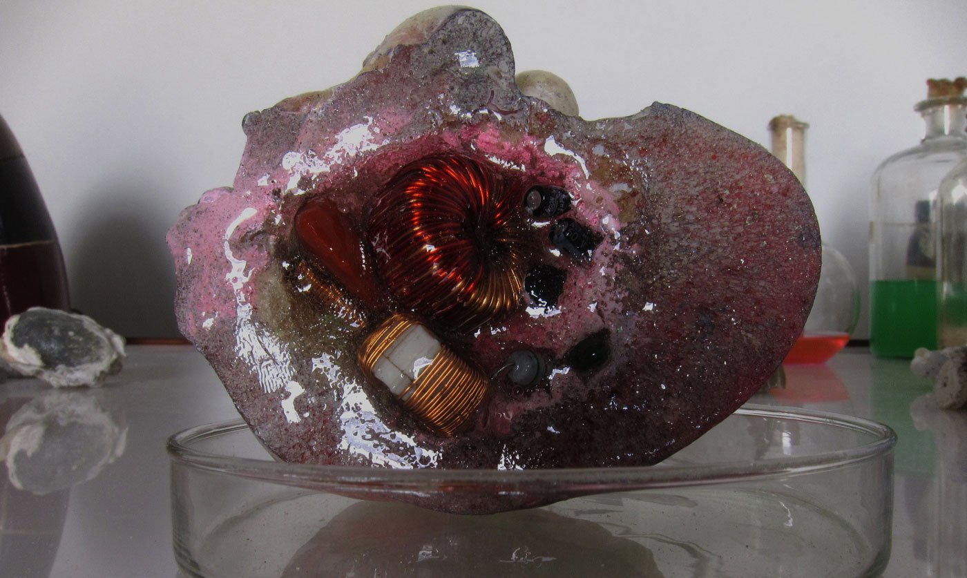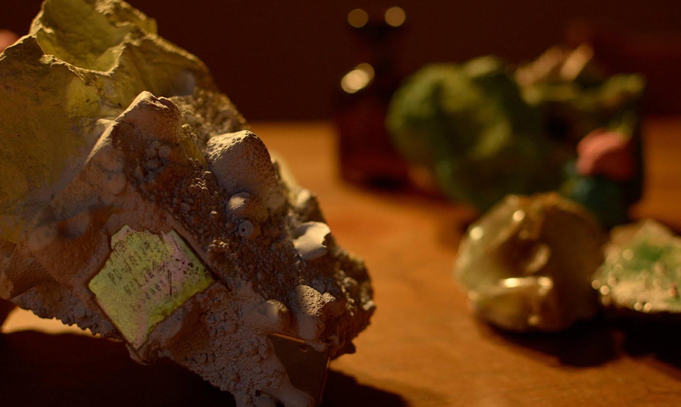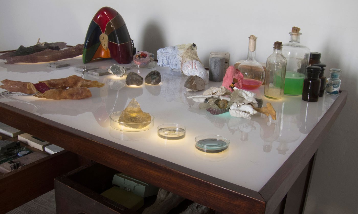 Le piccole sculture in mostra amalgamano forme di diversa natura, come calchi di denti, ossa, rami e foglie, ma anche plastiche, cavi, imballaggi e scarti tecnologici. Alcuni vengono mostrati archiviati nei cassetti, come classificati, altri a fare scena sulla scrivania, insieme a bottiglie, pinzette, disegni, libri e dipinti. Si riferiscono a quel luogo dove lo scienziato contempla e indaga i suoi oggetti di studio, a una sala di dissezione, a un laboratorio, a un gabinetto di curiosità, all’angolo di un museo di scienze naturali, o semplicemente alla scrivania di un dilettante di mondi da sogno.